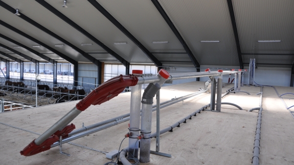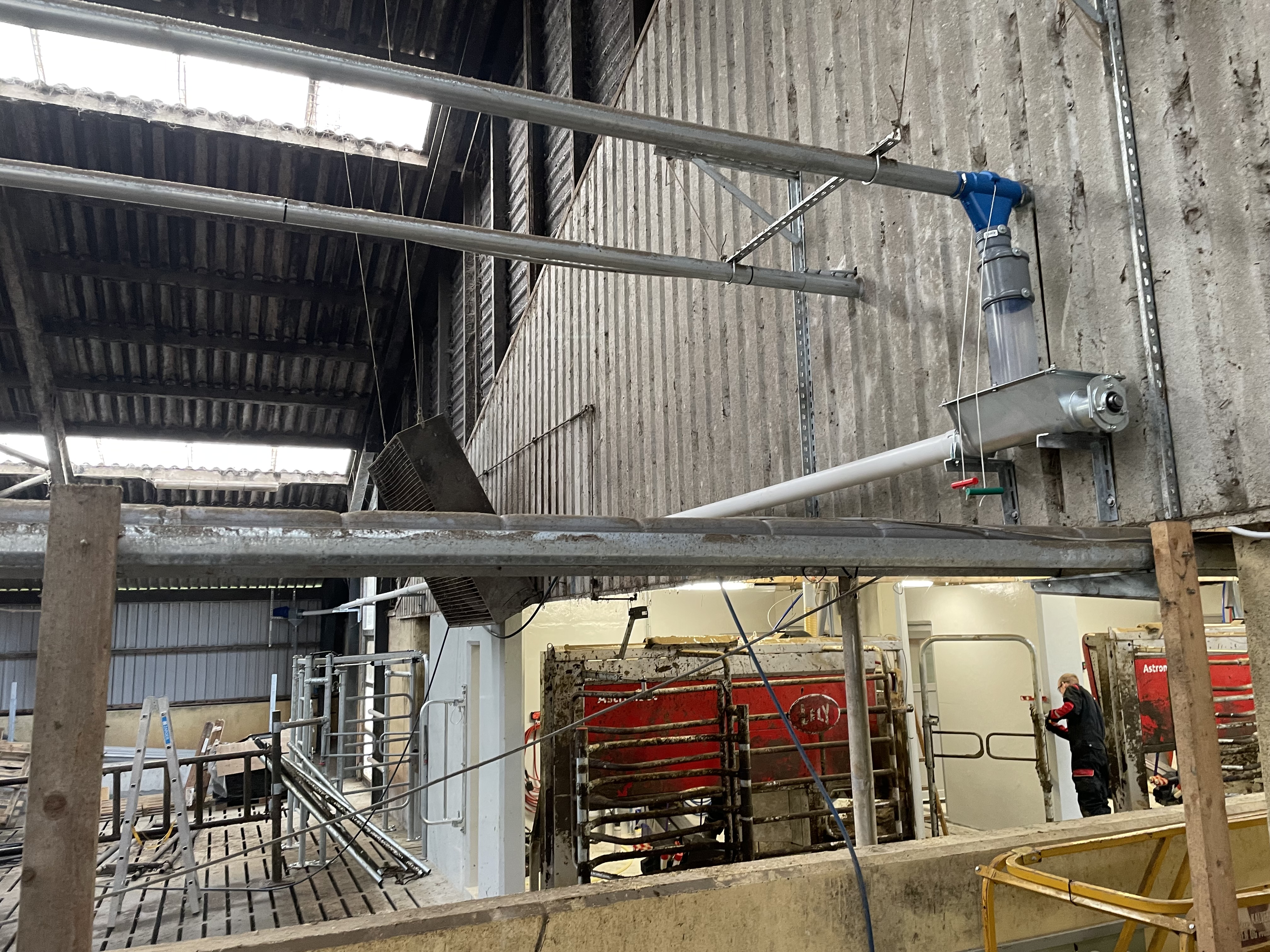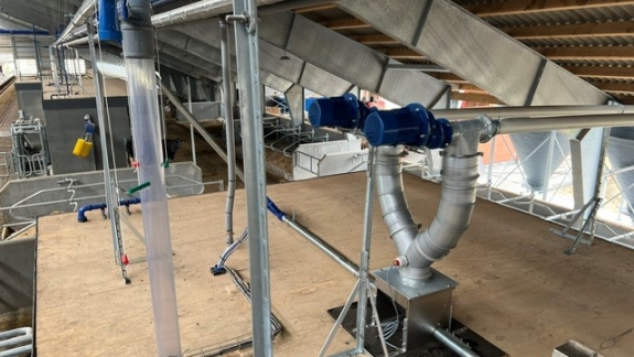 Feed line for filling for instance milking robots with force feed, rolled grain, soy grain and others.
