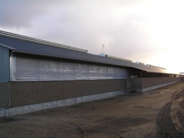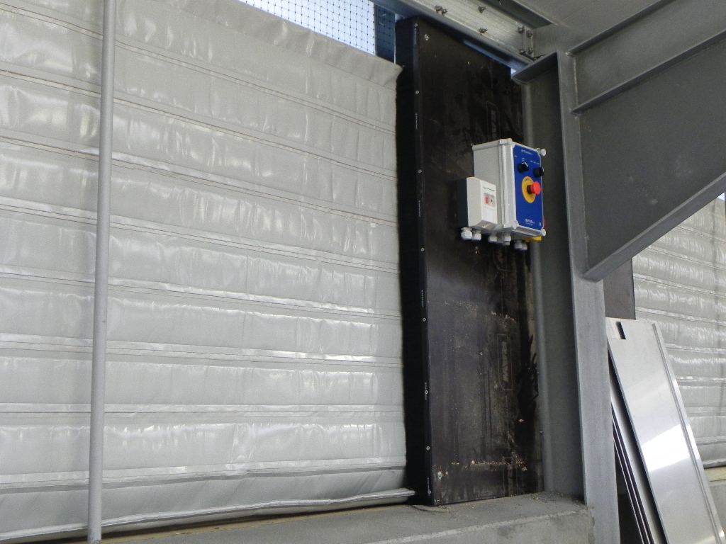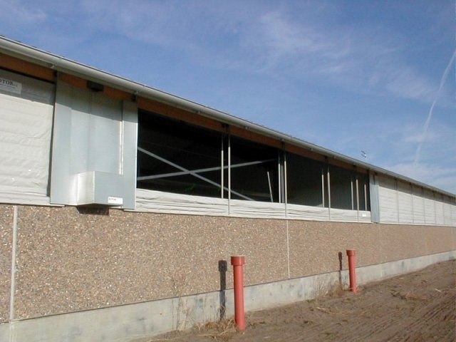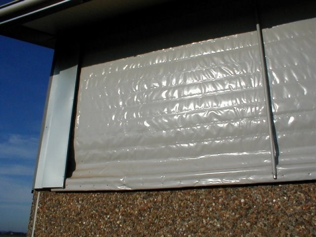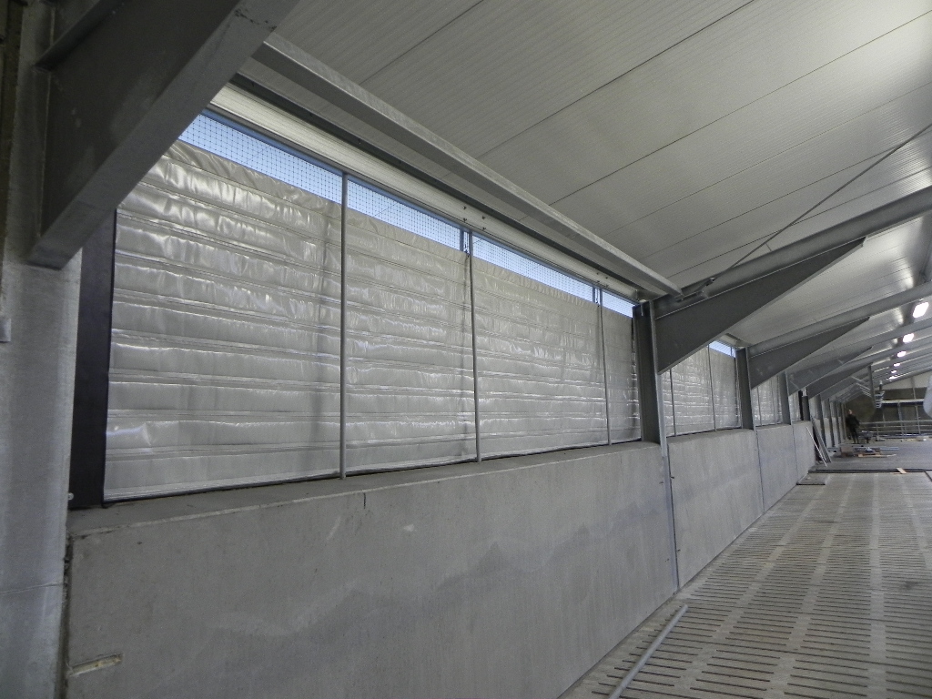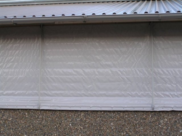 Gardinet fastgøres i bunden og hæves via wiretræk og hjul foroven. Der monteres indvendig og udvendig galvaniseret rør, som er beklædt med plastrør samt galvaniseret vindafskærmninger.​