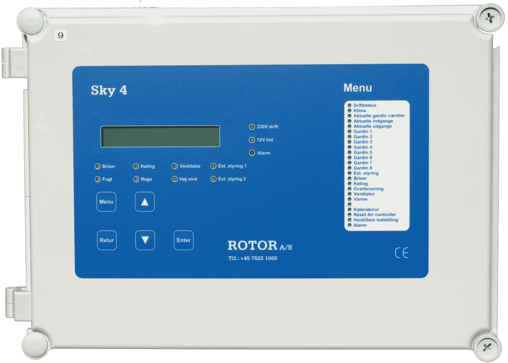 Sky 4 har otte udgange, som blandt andet kan bruges til gardinerne. Der kan også kobles varme eller loftventilator på disse udgange. Styringen kan modtage signaler fra andre styringer, der eksempelvis styrer en strømaskine, på den måde kan det styres, at gardinerne skal rulle for, når der strøs i stalden.