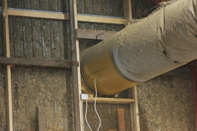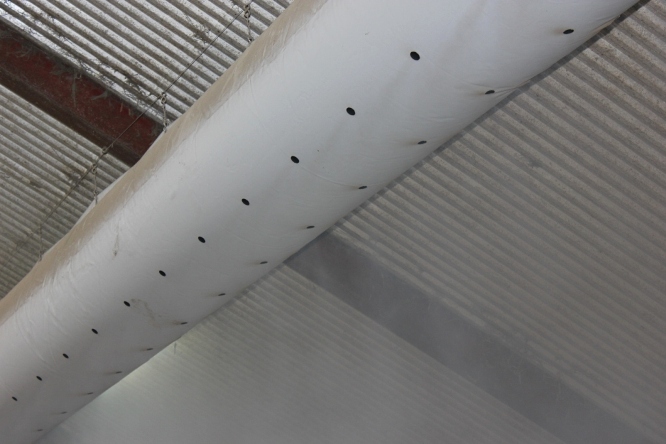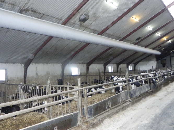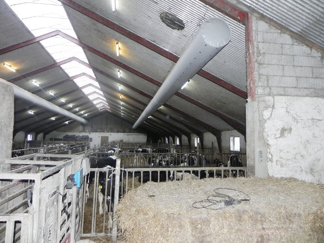 Overtryksventilation via indblæsning gennem pose til kalvestalde. Ventilatorer er testet i SjF vindtunnel, derved kan tubens længde og diameter dimensioneres, så den passer nøjagtig til den enkelte stald.